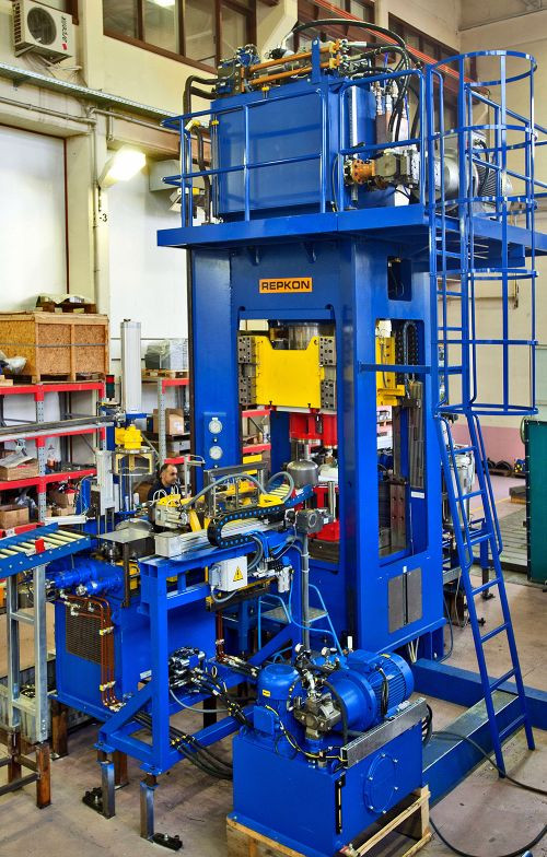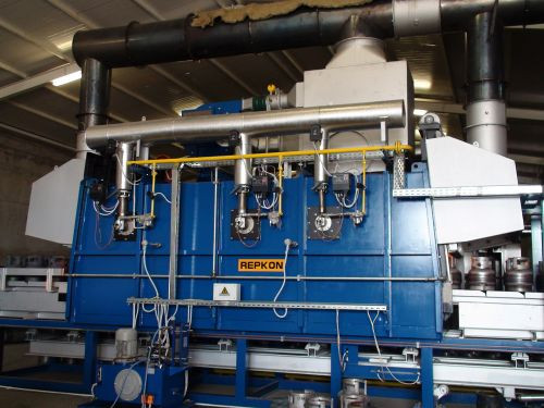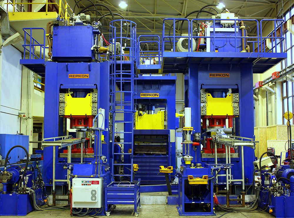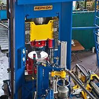 In the core of the forming line there stands a versatile double action REPKON hydraulic deep drawing press that forms the cylinder halves out of round blanks that are blanked by a single action double blanking REPKON press or directly from the coil material by help of REPKON design combined deep drawing, piercing and blanking die set. The edges of the upper and lower halves are further processed by REPKON trimming and joggling machines to the perfection stemming from the sheet metal forming expertise of REPKON to make it read for the body seam welding after degreasing.