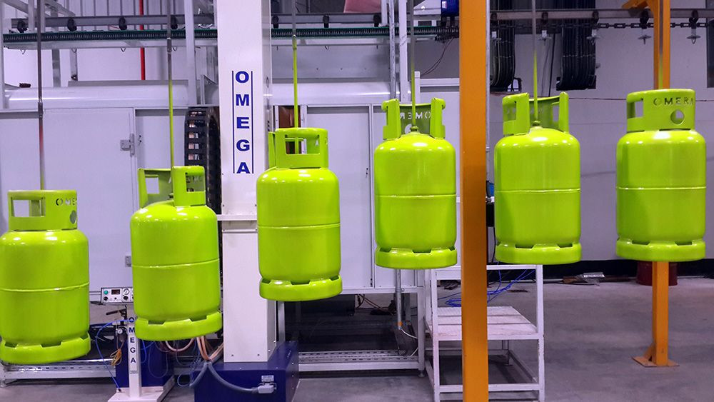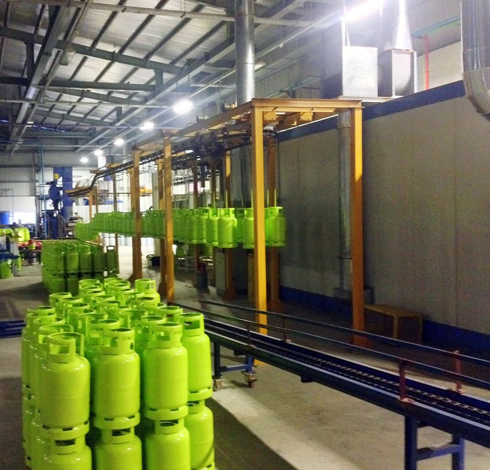 The LPG cylinders surfaces are shot blasted by the shot blasting machine in order to clean up the scales caused by the heat treatment operation to make the surface ready for the painting and or zinc spraying for those customers who requires zinc coating before painting. The double layer over cured painting of the cylinders is achieved automatically by the robotic paint application system in the painting line as the cylinders conveyed on overhead conveyor system through the primary and final coat painting cabinets separated by flash off tunnels before they get cured in the canopy type modern paint curing oven.